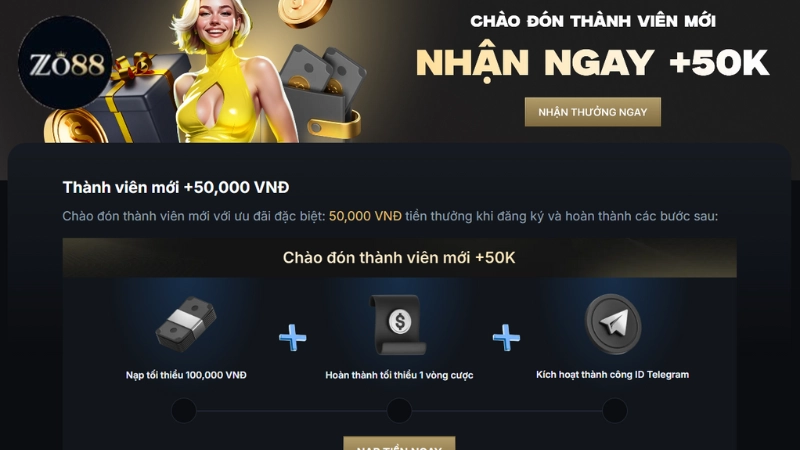 - Thành viên mới đăng ký tặng 50K: Khi có người chơi mới đăng ký nhà cái, hệ thống sau khi xác minh thành công chính chủ sẽ gửi về hòm thư 50K. Để nhận số tiền này, bạn cần nạp ít nhất 100K, tham gia tối thiểu 01 vòng cược và kích hoạt Telegram thành công.