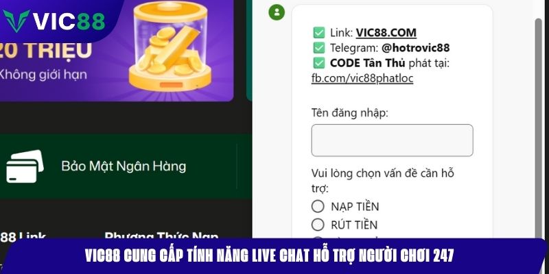 VIC88 cung cấp tính năng live chat hỗ trợ người chơi 24/7